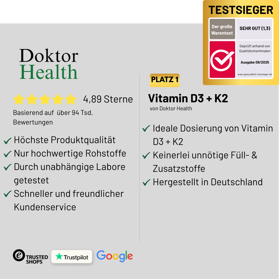 Das Doktor Health Vitamin D3 + K2 ist unser klarer Testsieger. Es überzeugt durch seine hohe Dosierung, Reinheit und die Kombination aus D3 + K2 MK-7 in Bioverfügbarkeit. Es unterstützt Knochen, Immunsystem, Herz und Muskeln zuverlässig.